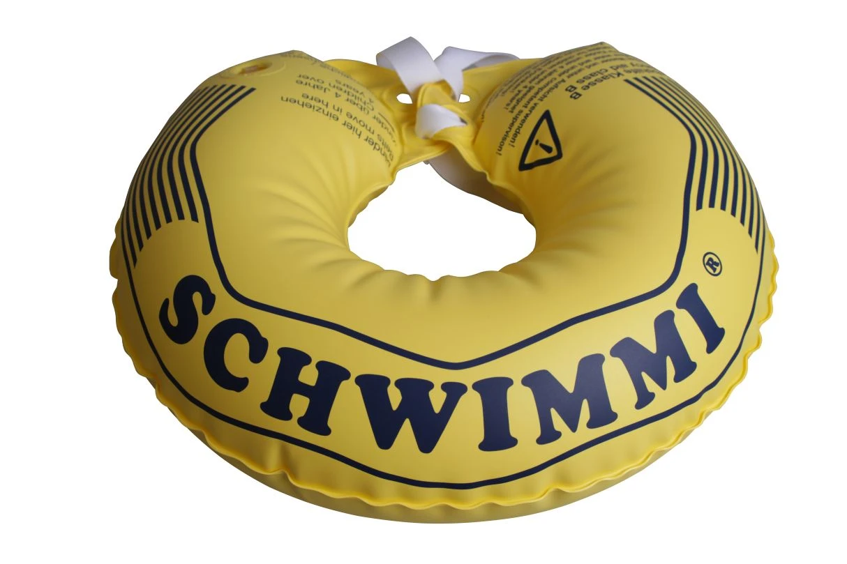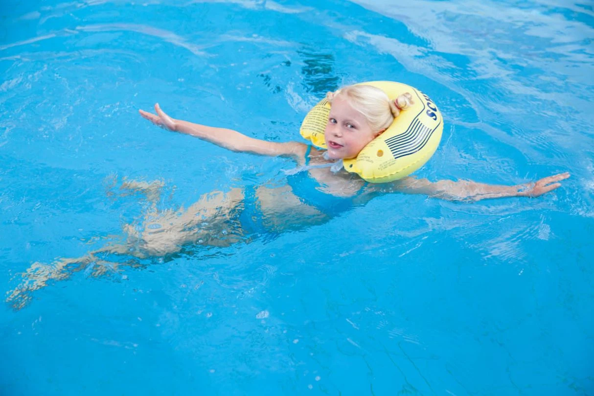 Der Schwimmkragen hält den Kopf über Wasser. Wie funktioniert es? Die Ventile für das Aufblasen mit dem Mund leicht zusammendrücken und anschließend mit dem Stopfen verschließen. Die Bänder je nach Halsumfang in die hinteren oder vorderen Löcher einziehen und eine feste Schlaufe binden. Nach Gebrauch mit klarem Wasser abspülen und trocknen lassen.