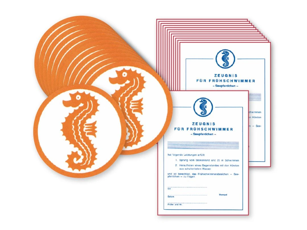 Geeignet für alle prüfungsberechtigten Personen und Institutionen, die das Abzeichen Seepferdchen abnehmen. Das Seepferdchen erfordert 25 m Schwimmen, den Sprung vom Beckenrand und das Heraufholen eines Tauchrings aus brusttiefem Wasser. Mit dem Abzeichen zum Aufbügeln wird das Anbringen an der Badebekleidung kinderleicht.